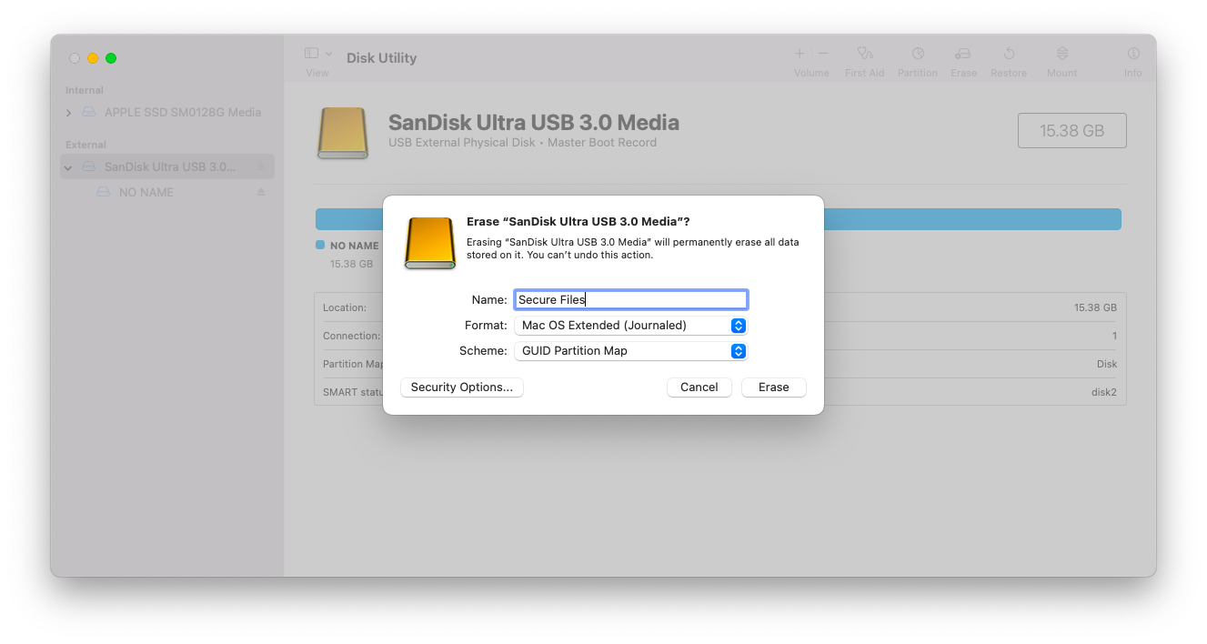 - Click the Erase button on top of the right pane to bring up the Erase USB dialog. You have Name, Format, and Scheme