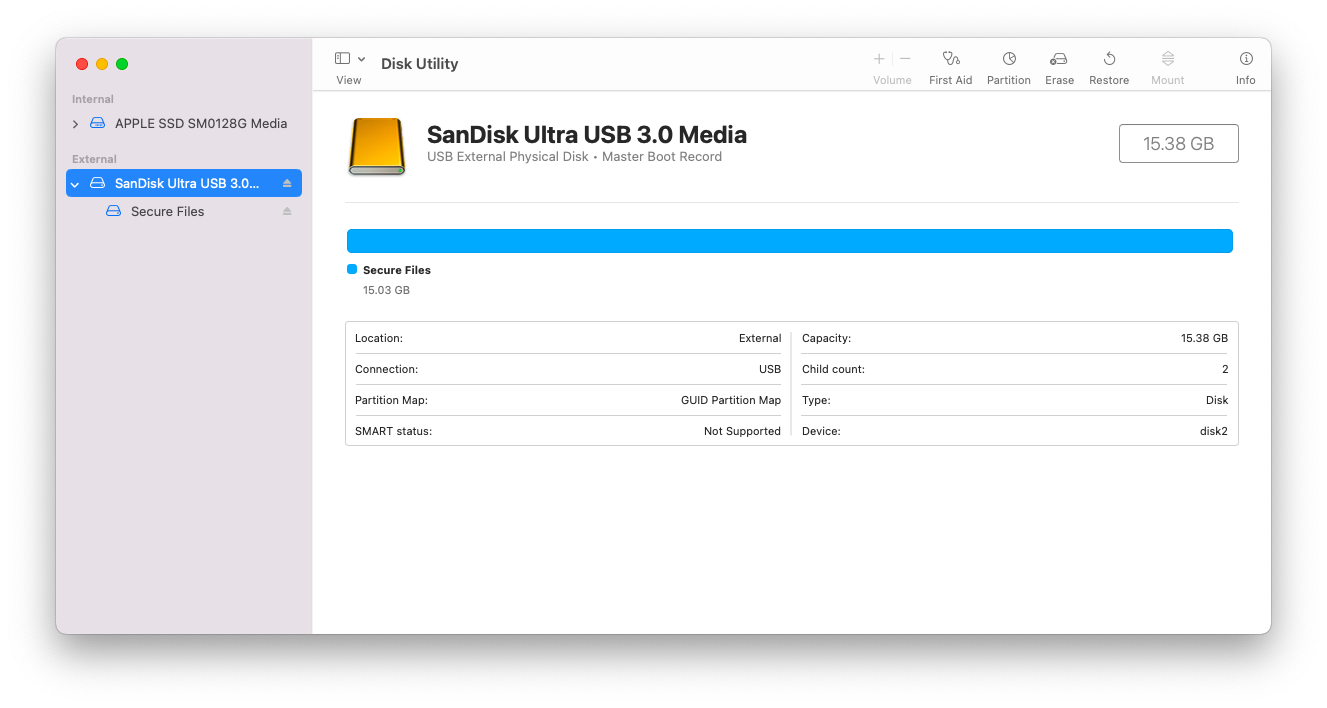 - Select your USB drive in the left panel under the heading External. Tip: Click on the heading to see the drop-down list of all active external devices.