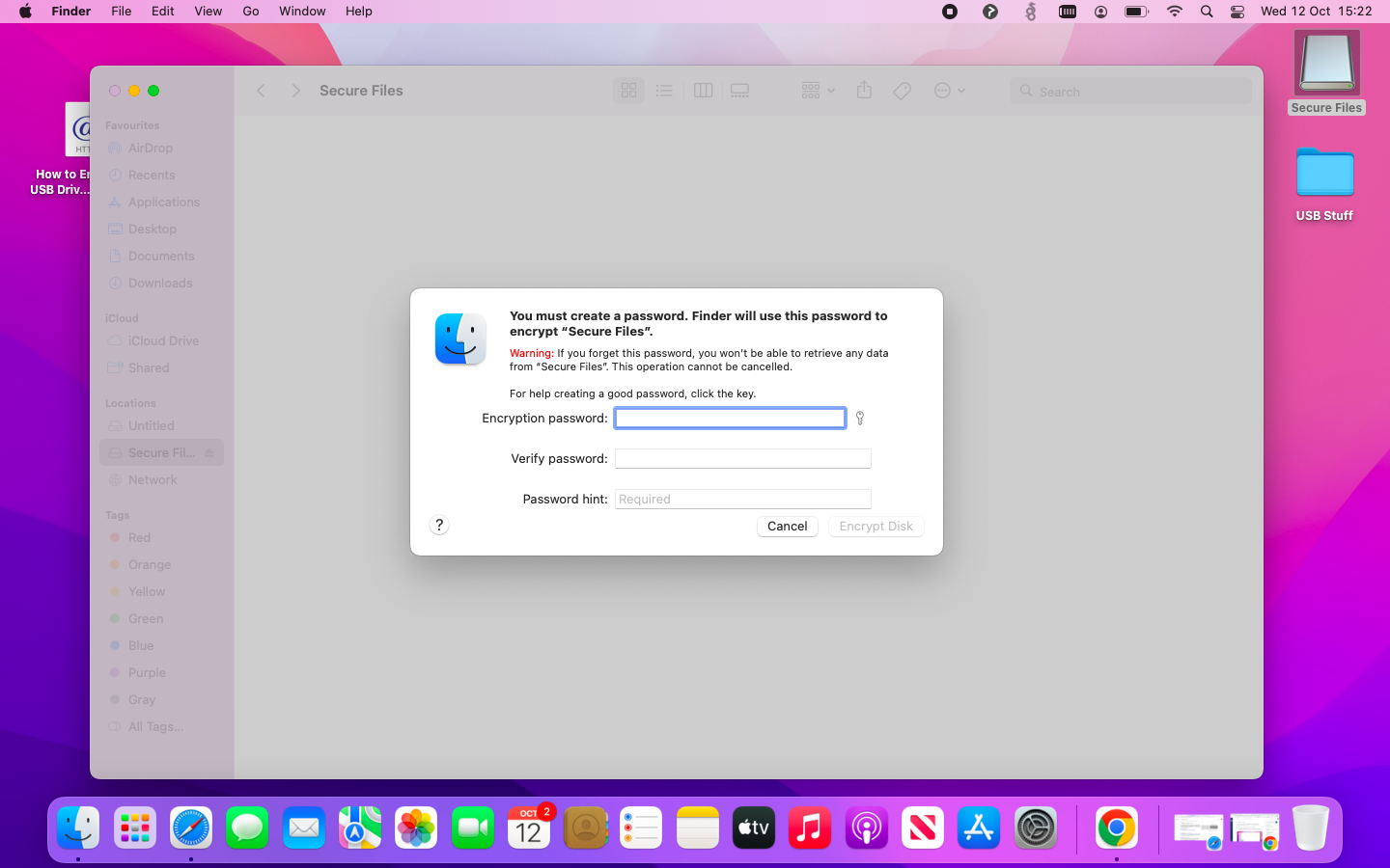 - Click Encrypt Disk. Wait for the process to complete. If it’s successful, the drive icon disappears and remounts Done!